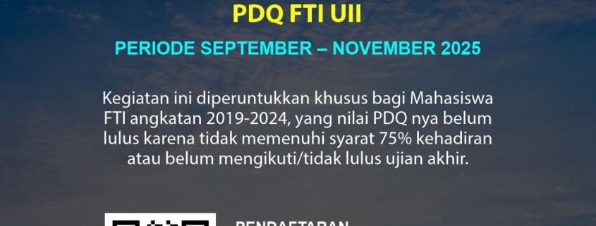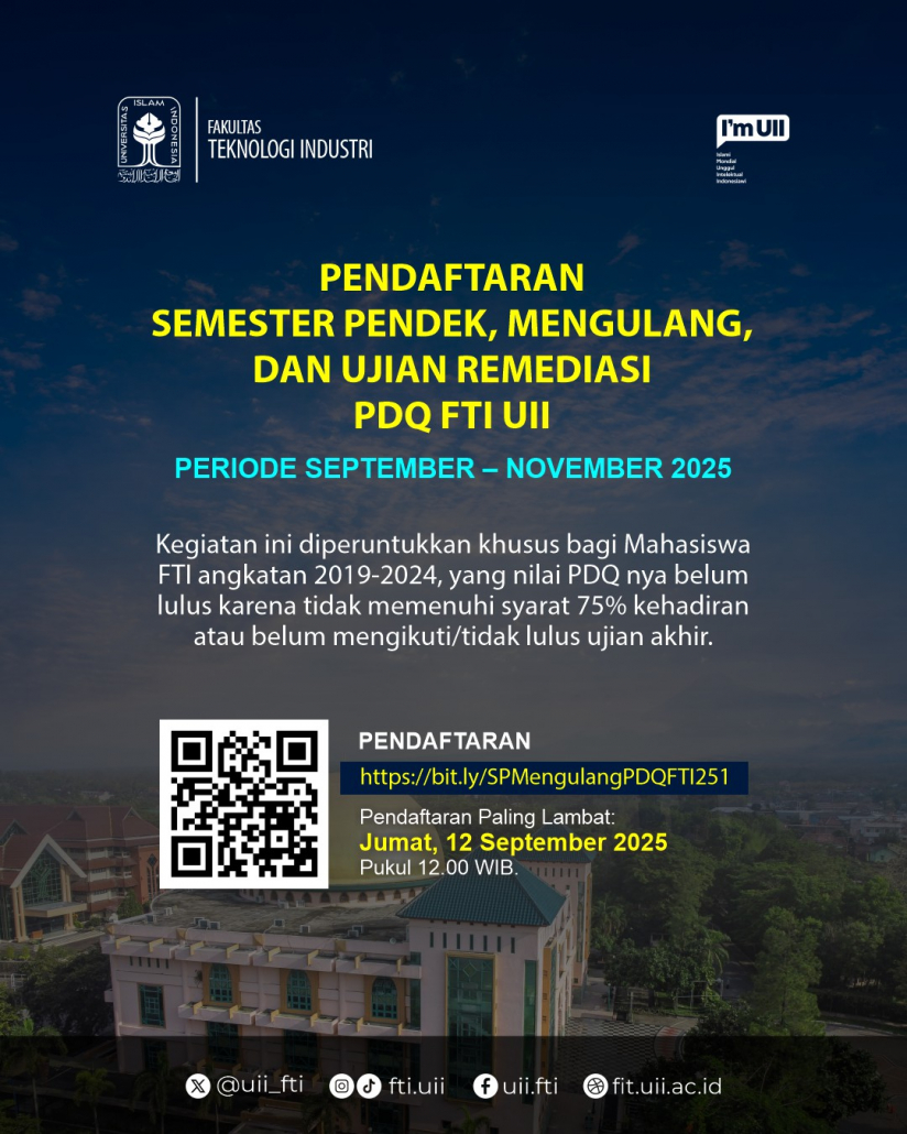 Panitia Pengembangan Diri Qurani (PDQ) Fakultas Teknologi Industri (FTI) membuka Semester Pendek atau Mengulang dan Ujian Remediasi/Ujian Akhir PDQ FTI di Periode September – November 2025.