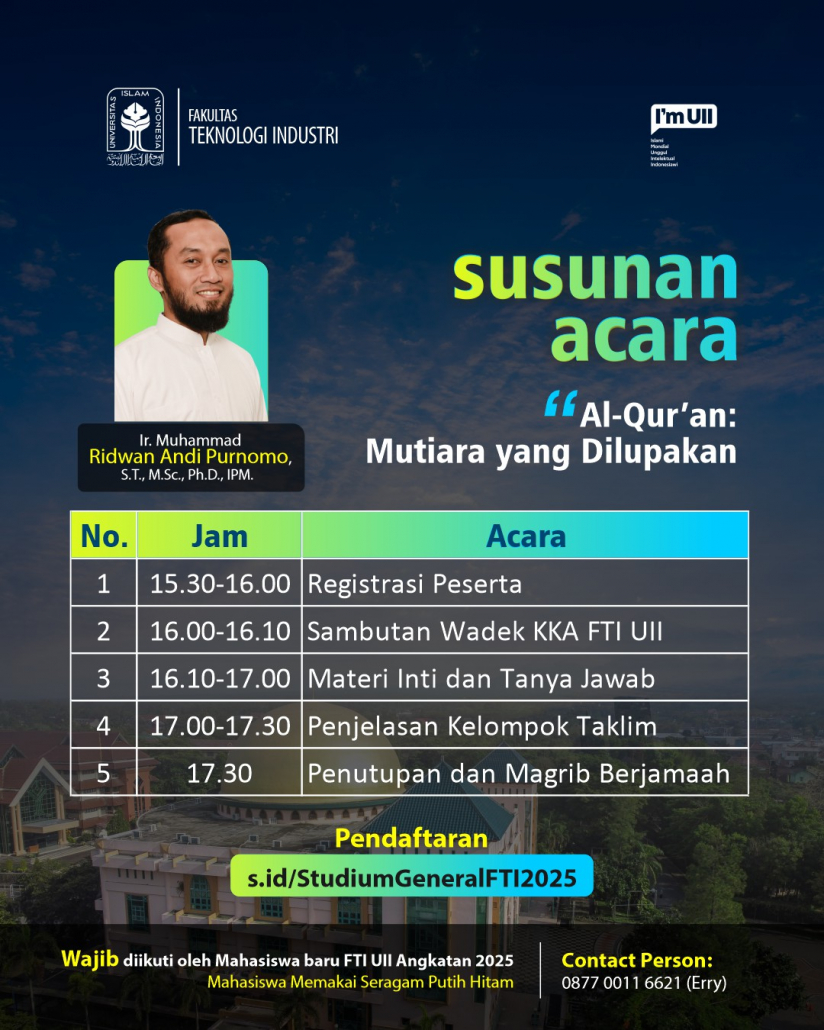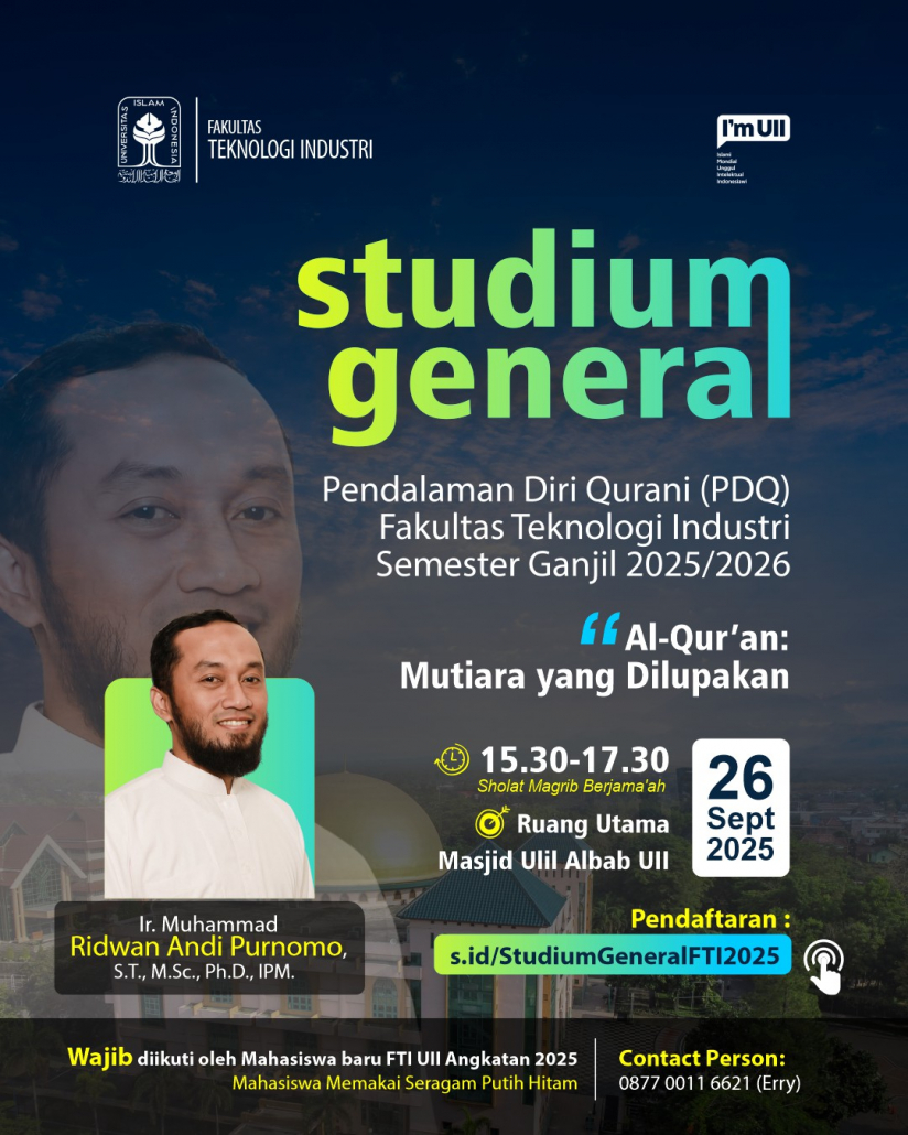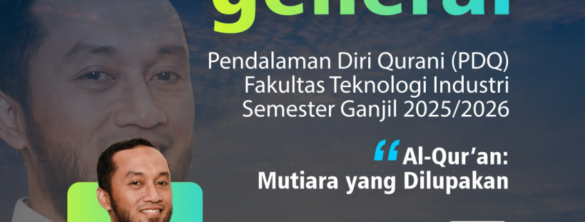 Bersama ini kami mengundang segenap Mahasiswa Baru Angkatan 2025 FTI UII untuk mengikuti kegiatan Studium Generale Pendalaman Diri Qurani (PDQ) FTI Semester Ganjil 2025/2026 bertema “Al-Qur’an: Mutiara yang Dilupakan”.